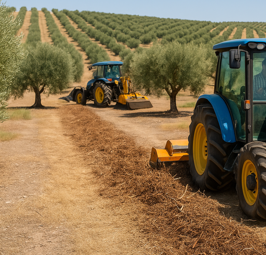 Empecemos por el suelo, porque ahí se decide buena parte del consumo de agua y del gasto en insumos. Durante años se ha entendido el herbicida como la vía rápida para mantener el terreno “limpio”. Es cierto que una pasada deja el suelo visualmente impecable y libera mano de obra a corto plazo, pero tiene efectos colaterales que se pagan más tarde: desprotege la superficie frente a las primeras lluvias, fomenta la costra, aumenta la escorrentía y la pérdida de finos, y obliga a repetir la intervención cuando repuntan las hierbas, justo cuando menos conviene. La alternativa no es “abandonar” el control, sino gestionar una cubierta que trabaje a favor nuestro. Una cubierta bien llevada —espontánea o sembrada— reduce la evaporación directa, mejora la infiltración de las lluvias, frena la erosión y amortigua el pisoteo de la maquinaria. Traducido a euros, significa menos herbicida, menos riegos de apoyo en regadío y una estructura de suelo que soporta mejor los estreses de calor. La clave es el cómo: no se trata de dejar crecer sin control, sino de mantener la cubierta baja y activa en otoño-invierno y reducir su competencia cuando el olivo lo necesita. Segar antes de las olas de calor, dejar un acolchado fino que cubra el suelo y evitar cordones que ardan o atraigan barrenillo marcan la diferencia entre una cubierta que ahorra y una que estorba. En parcelas con muy poca agua disponible, el equilibrio es fino, pero incluso ahí una franja alterna o un mosaico bien diseñado acostumbra a salir a cuenta frente al “desnudo” sistemático.